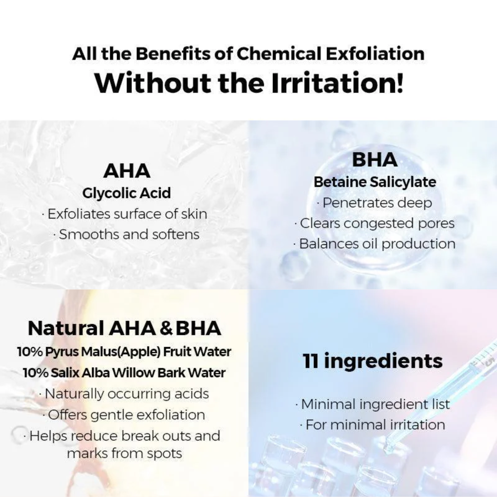 • Betaine Salicylate (BHA) – Clears pores & controls excess oil
