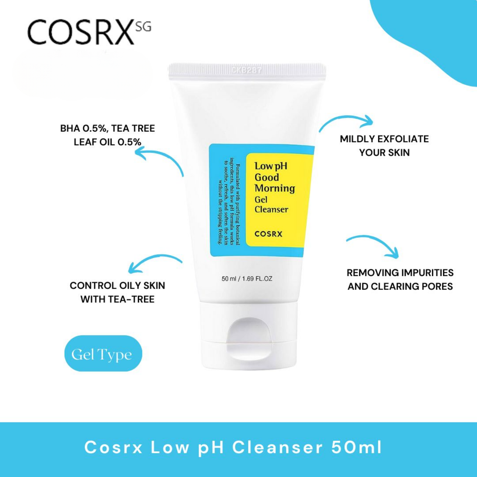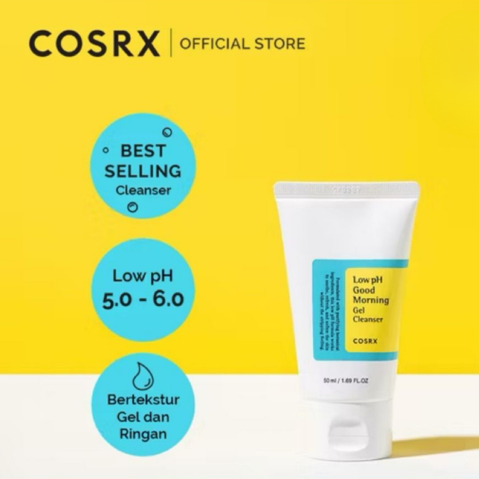 COSRX Low pH Good Morning Gel Cleanser 50ml – Gentle daily cleanser with Tea Tree Oil & BHA to balance pH, remove impurities, and protect the skin barrier. Suitable for all skin types, even sensitive skin.