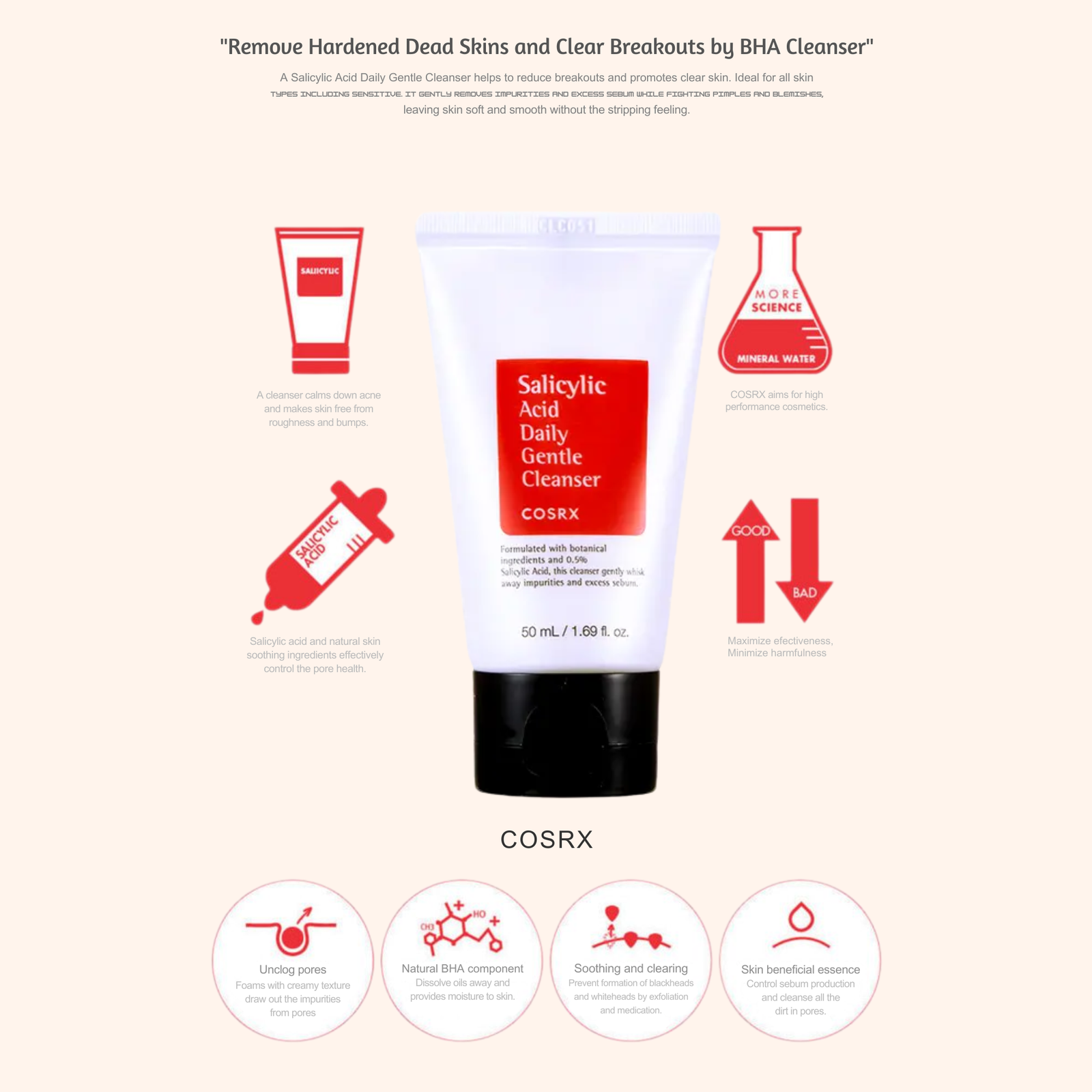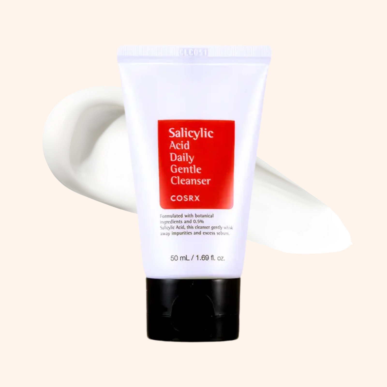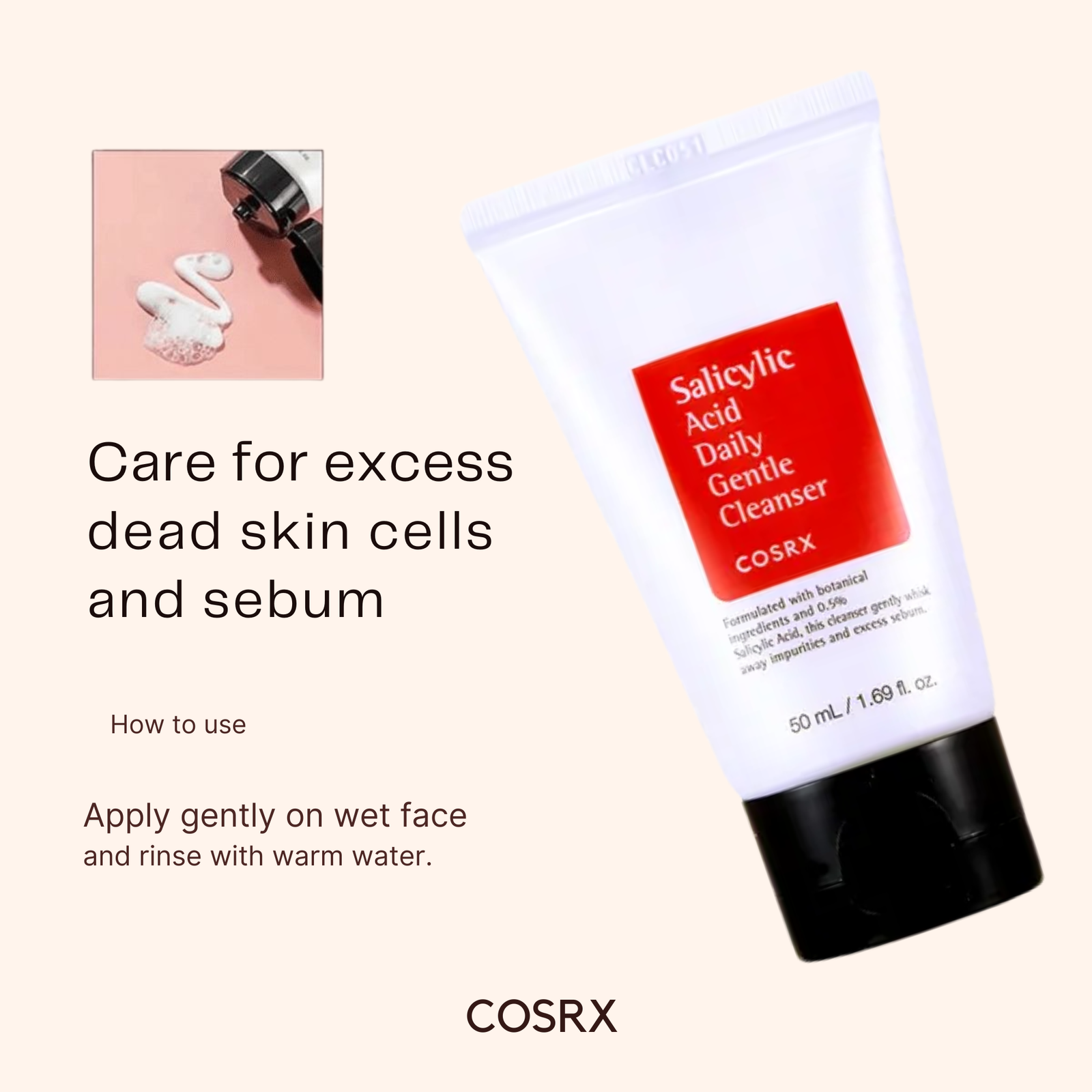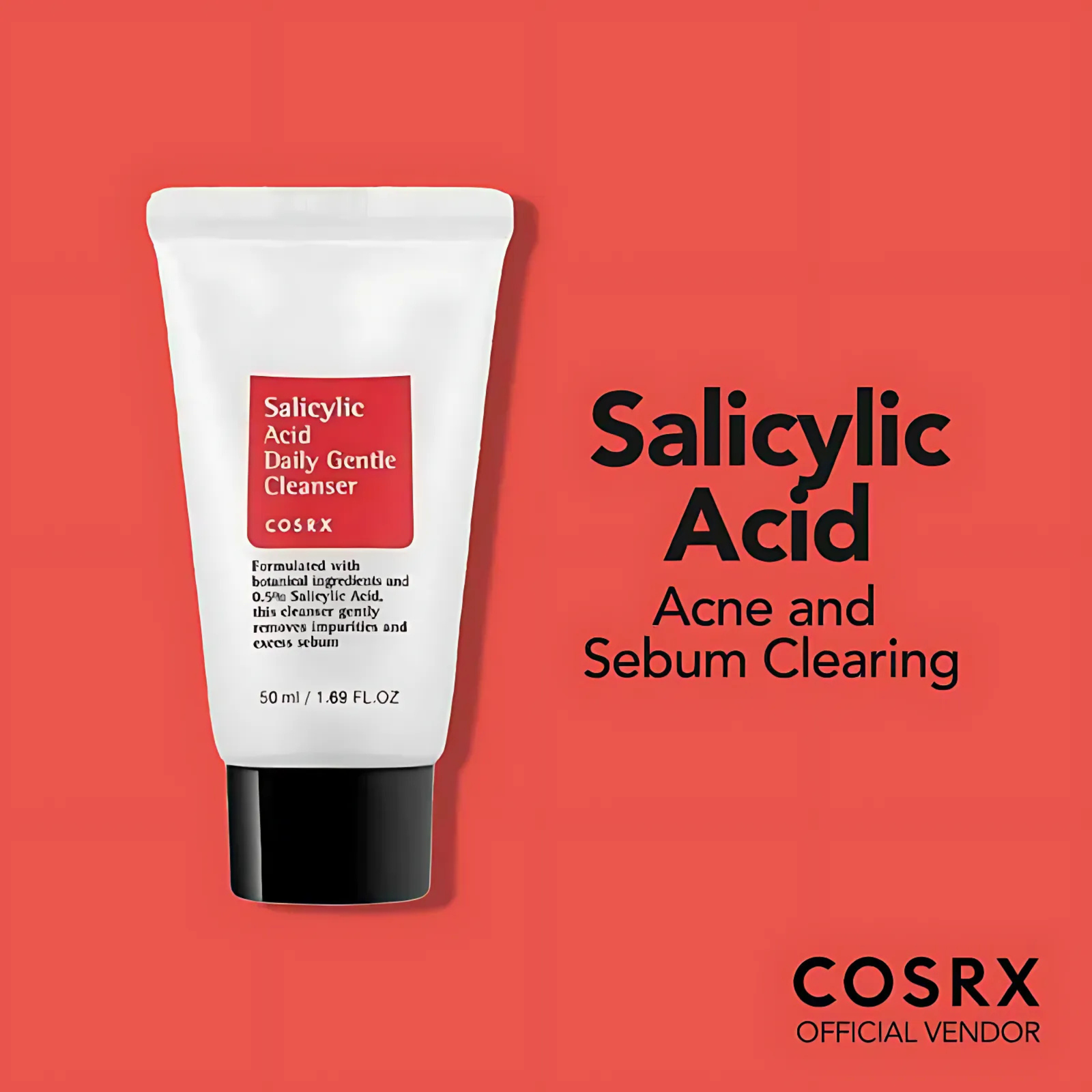 COSRX Salicylic Acid Daily Gentle Cleanser 50ml – A gentle foaming face wash enriched with Salicylic Acid, Tea Tree Oil, and Centella Extract. Effectively reduces acne, blackheads, and excess oil while keeping skin hydrated and refreshed. Perfect for oily, combination, and acne-prone skin.