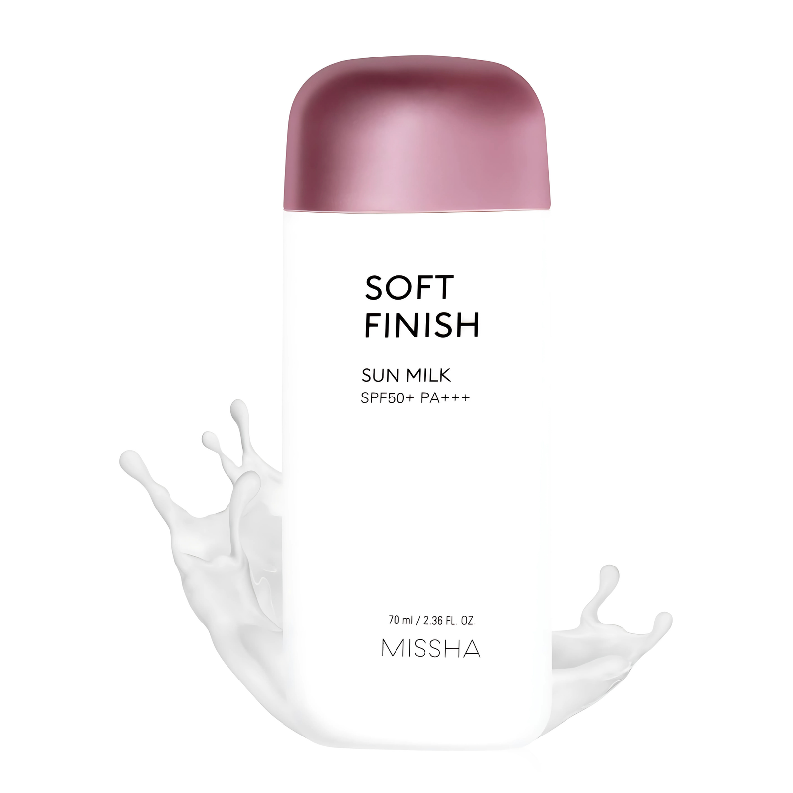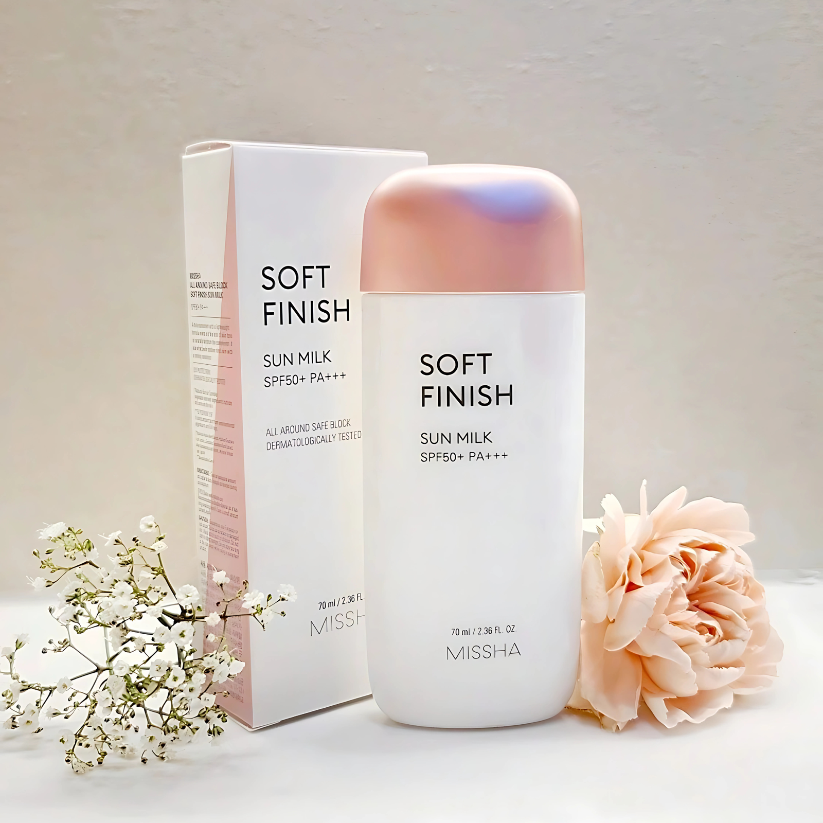 Missha All-Around Safe Block Soft Finish Sun Milk SPF50+ PA+++ – Lightweight, matte-finish sunscreen that protects against UVA/UVB rays, prevents dark spots, and keeps skin fresh.