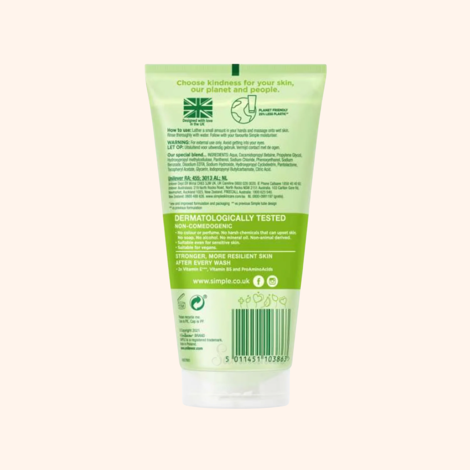 Simple Kind to Skin Refreshing Facial Wash with Vitamin B5+E – A gentle, soap-free gel cleanser enriched with Pro-Vitamin B5, Vitamin E, and Pro Amino Acids. Removes dirt, oil, and makeup without drying, leaving skin soft, fresh, and healthy-looking. Perfect for all skin types, even sensitive.
